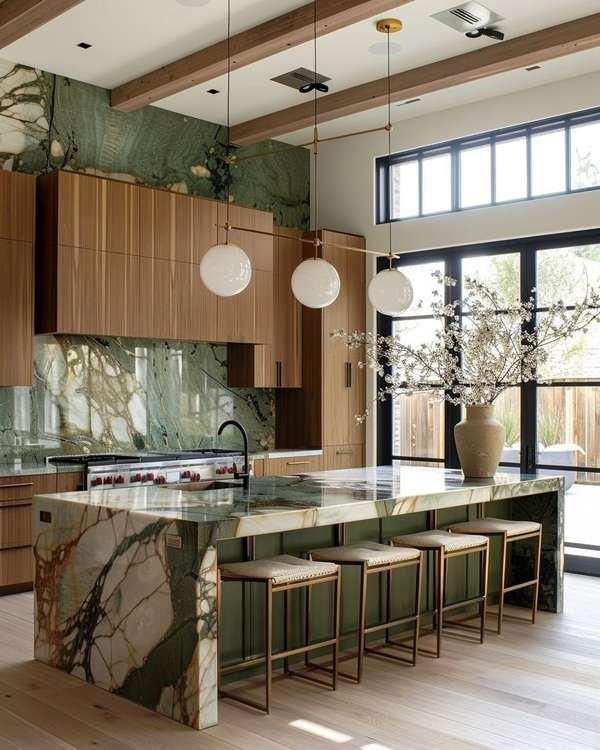 - Waterfall edges: Countertops that flow over the island sides remain one of the most requested premium details, especially in veined stone where the continuous pattern wraps the island in drama.