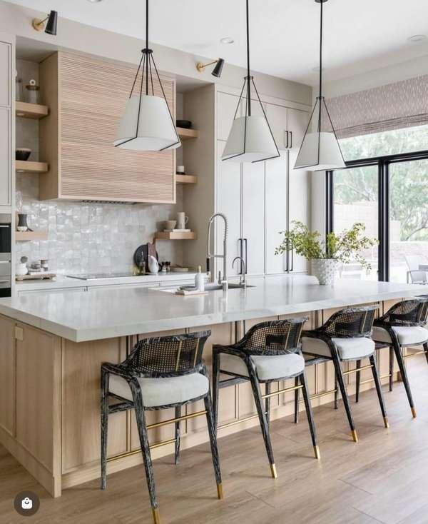 Engineered quartz is the most practical choice for families: non-porous, no sealing required, highly durable. Natural marble is the most beautiful but requires annual sealing and develops a patina with use. Butcher block is ideal for dedicated prep zones. Many designers now combine two materials on a single island — stone for prep, wood for the seating overhang.