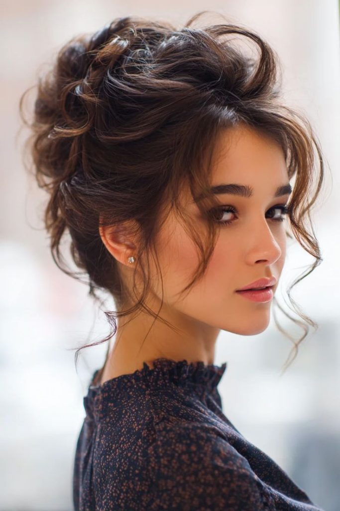 - The Look: A high, voluminous updo (like a messy bun or a chic topknot) with soft, wispy pieces left out to frame the face.