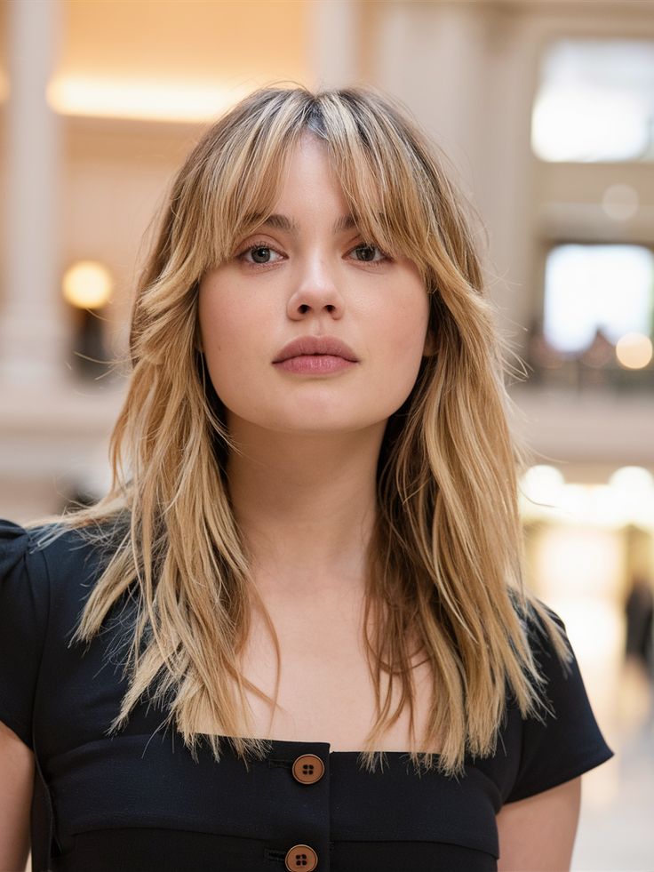 - Why it Works: The curtain bangs soften the forehead and temples. The abundance of layers throughout the hair creates movement and volume, which breaks up the solid lines of the jaw and adds a soft, feathered frame around the entire face.