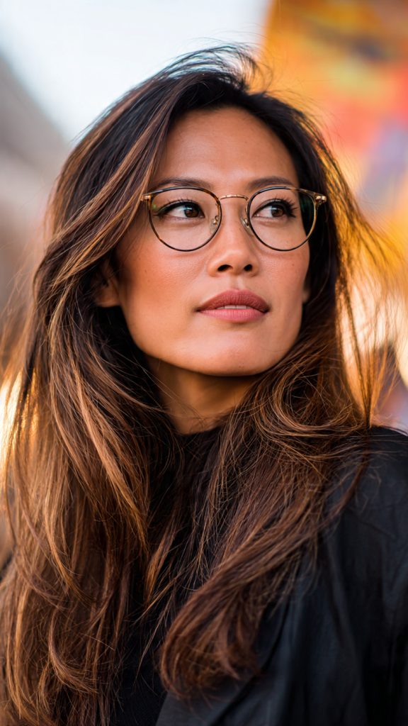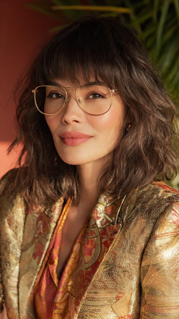 A layered lob creates movement around the face, preventing glasses from feeling heavy or overpowering.