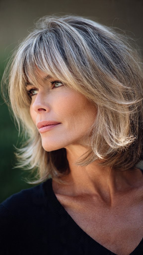 A textured bob adds softness and avoids the overly sharp look that can age the face.