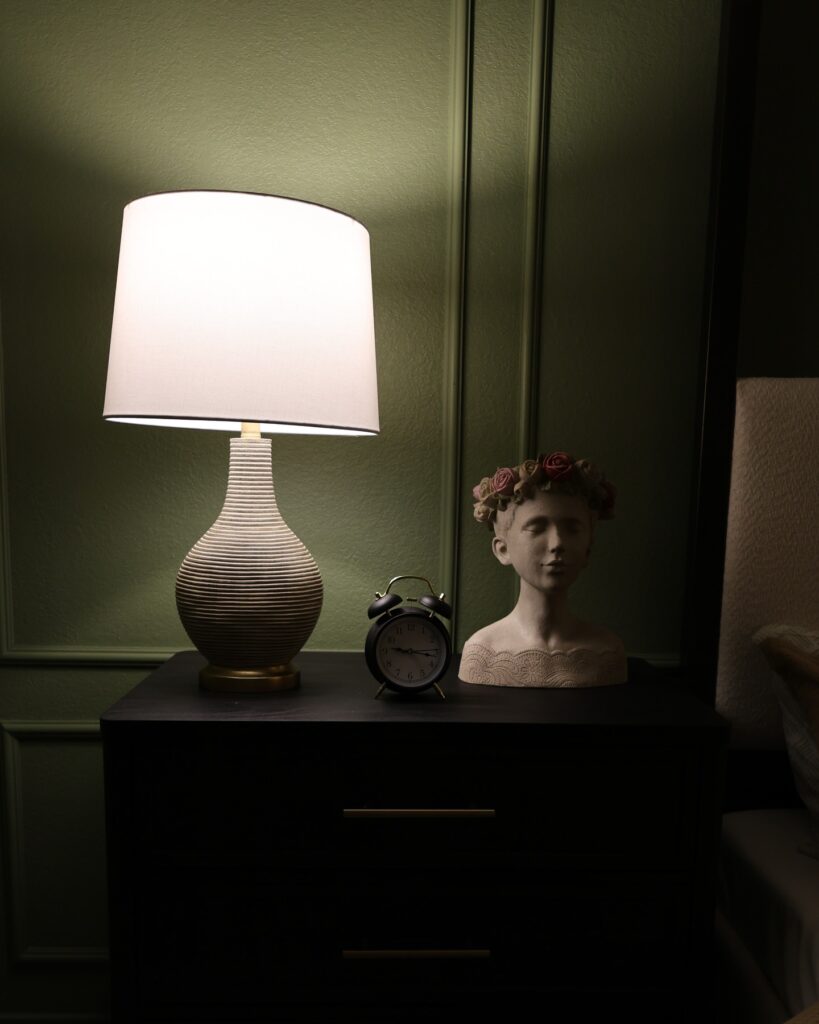 This nightstand embraces a rich, moody aesthetic that feels both dramatic and refined. The deep green wall paneling creates a sophisticated backdrop, allowing the warm glow of the table lamp to take center stage.