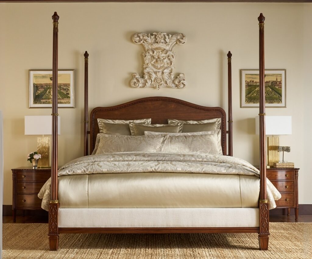 This nightstand idea is perfect for lovers of classic, timeless bedroom design. The rich wooden nightstands bring warmth and depth to the space, echoing the luxurious tones of the four-poster bed. Their curved fronts and polished finish add an old-world elegance that feels both refined and inviting.