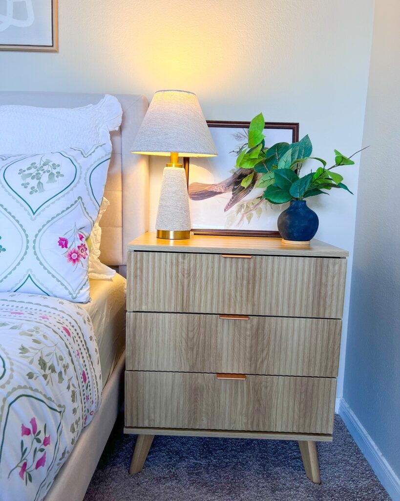 This nightstand setup beautifully blends warmth, color, and simplicity to create a welcoming bedside moment. The wood grain on the nightstand adds instant texture, while the sleek brass handles keep the look modern and polished.