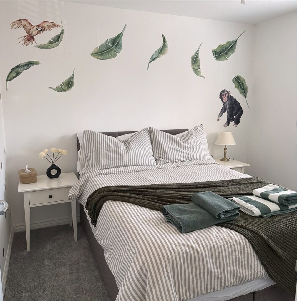 This setup keeps things simple yet full of personality. The white nightstand blends effortlessly into the bright room, letting the fun wall art and soft, striped bedding stand out. It’s the perfect example of how a nightstand doesn’t need to be busy to look complete.