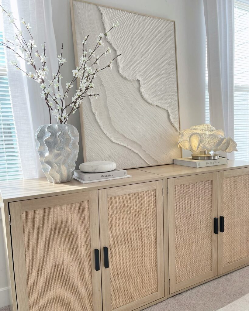 On the opposite side, a unique lamp doubles as décor, bringing a warm glow and an artistic touch. The natural wood cabinet base ties everything together with its light, airy tone and cane panels that add subtle texture.