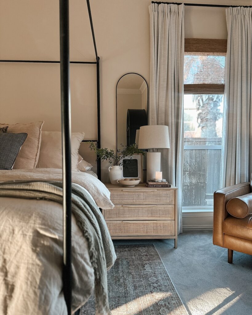 This nightstand setup is the perfect example of calm, collected styling that instantly makes a bedroom feel more refined. The light wood nightstand brings in natural warmth, while the woven-front drawers add subtle texture without overwhelming the space. It’s understated but far from plain.