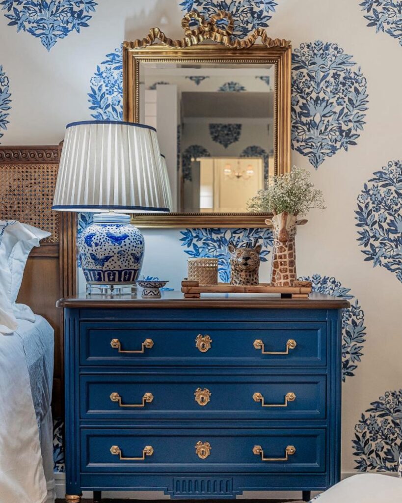 This nightstand idea proves that bedside décor can be both functional and full of personality. The deep blue dresser-style nightstand instantly becomes the focal point, especially paired with gold hardware that adds a touch of luxury. A classic blue-and-white ceramic lamp ties beautifully into the wallpaper, creating a cohesive pattern-on-pattern look. The gold-framed mirror above extends the height of the vignette and reflects light, making the space feel brighter.