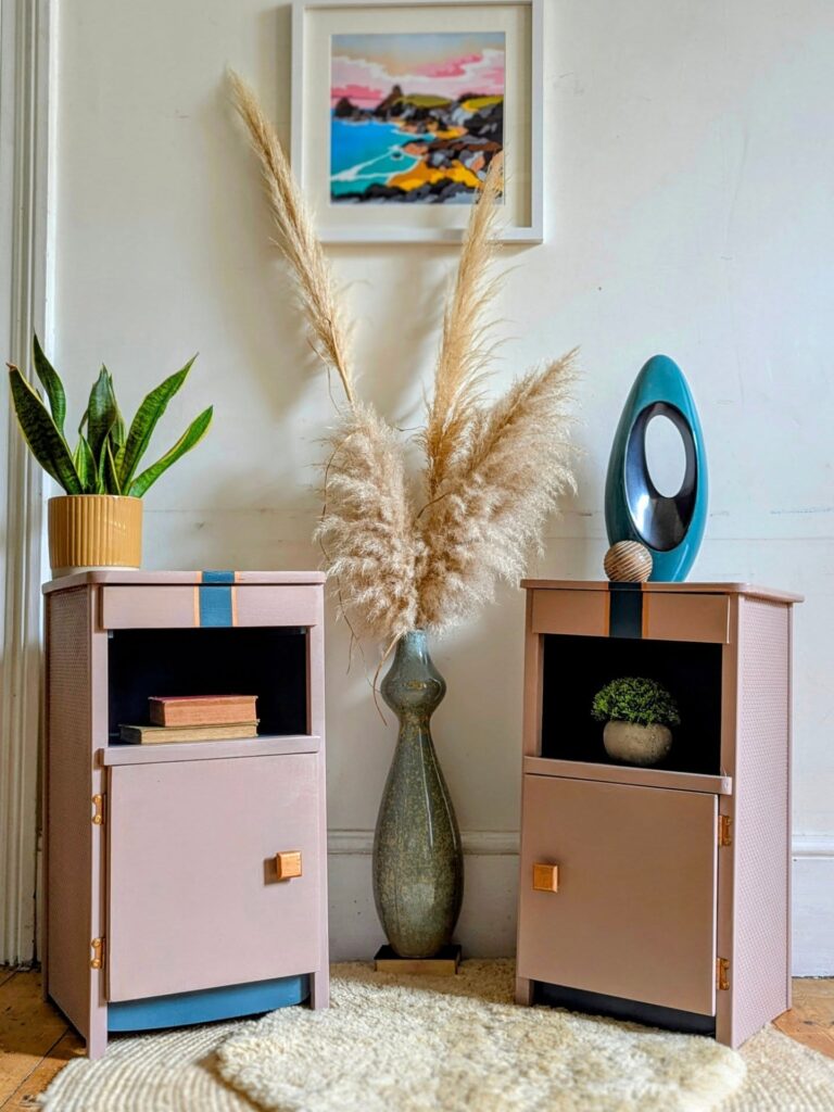 This pair of nightstands brings a fresh, artsy energy into the bedroom, proving that styling doesn’t always have to be formal or traditional. The soft blush-pink finish paired with bold teal accents gives these pieces a fun, modern personality. They immediately brighten the space and show just how stylish upcycled furniture can be.