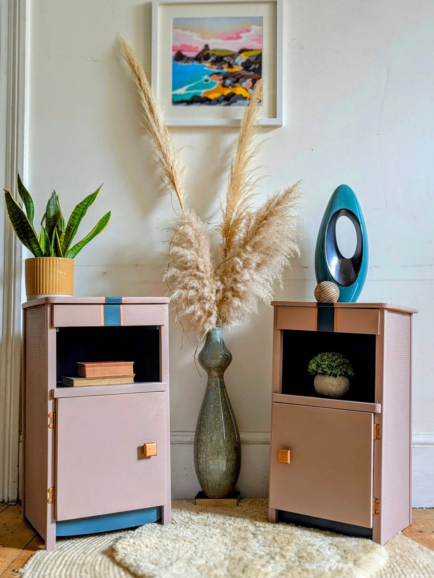 Centered between the two nightstands, the tall vase filled with pampas grass creates height and softness. It anchors the entire arrangement and ties the two pieces together beautifully. Above it, the colorful wall art brings in playful coastal tones that complement the palette below and pull the whole look upward.