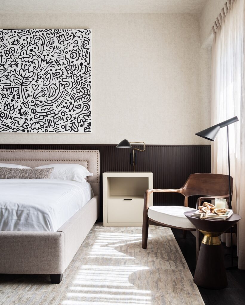 A single modern task lamp adds both sculptural interest and practical lighting, proving that you don’t need many pieces to make a nightstand feel complete. The surrounding elements – a sculptural wood accent chair, a dark pedestal side table, and soft filtered light from the curtains – frame the nightstand beautifully and enhance the modern gallery-like vibe.