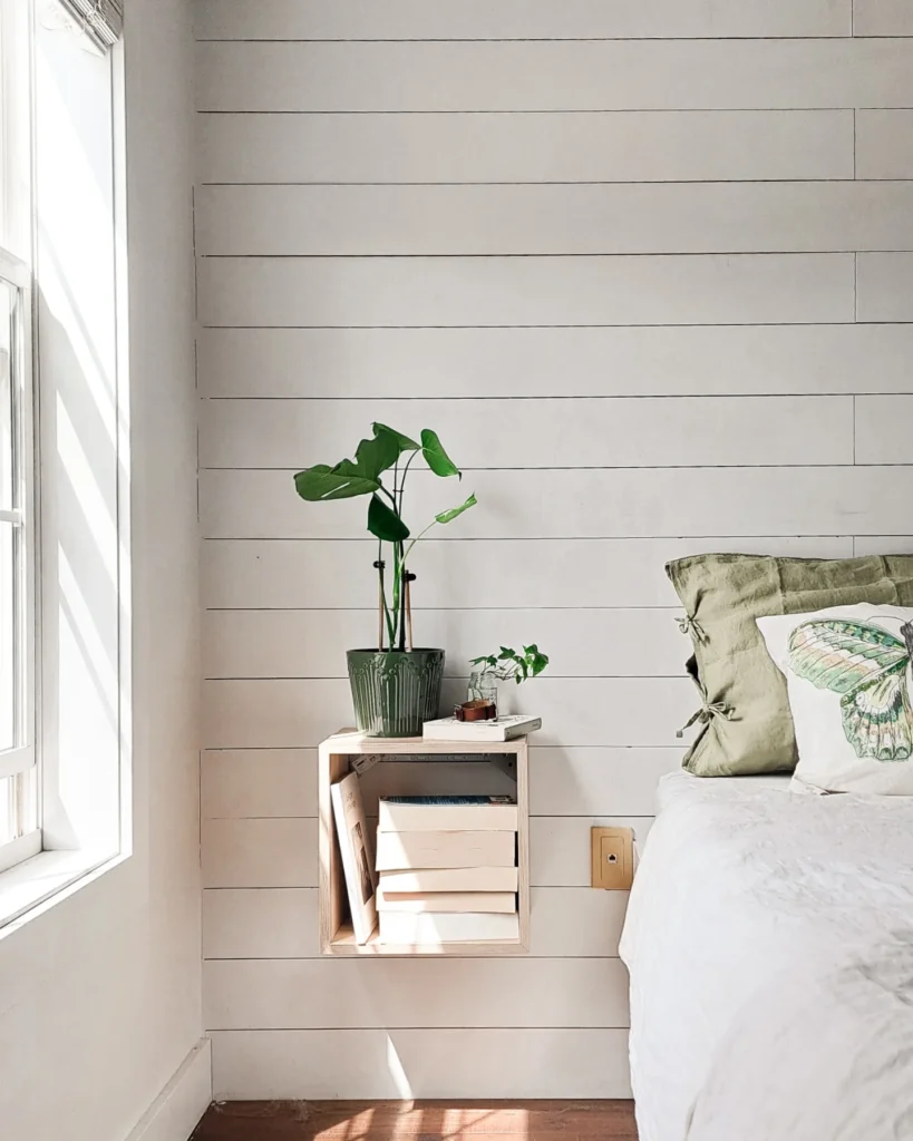This idea proves that a nightstand doesn’t need legs to make a big impact. The floating wooden cube keeps the space feeling open and light, perfect for small bedrooms or anyone who loves a clean, uncluttered look. It doubles as both a shelf and a display surface, offering just enough room for bedtime essentials without overwhelming the room.