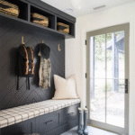Large floor-to-ceiling windows flood the room with natural light, showcasing outdoor greenery and blurring the line between interior and nature, a core Japandi principle. A whimsical wool-covered stool adds a subtle hint of softness and playfulness, preventing the room from feeling too austere. The sleek black cabinetry and stone surfaces complete the space with refined restraint, proving how Japandi decor thrives on balance, contrast, and thoughtful simplicity.