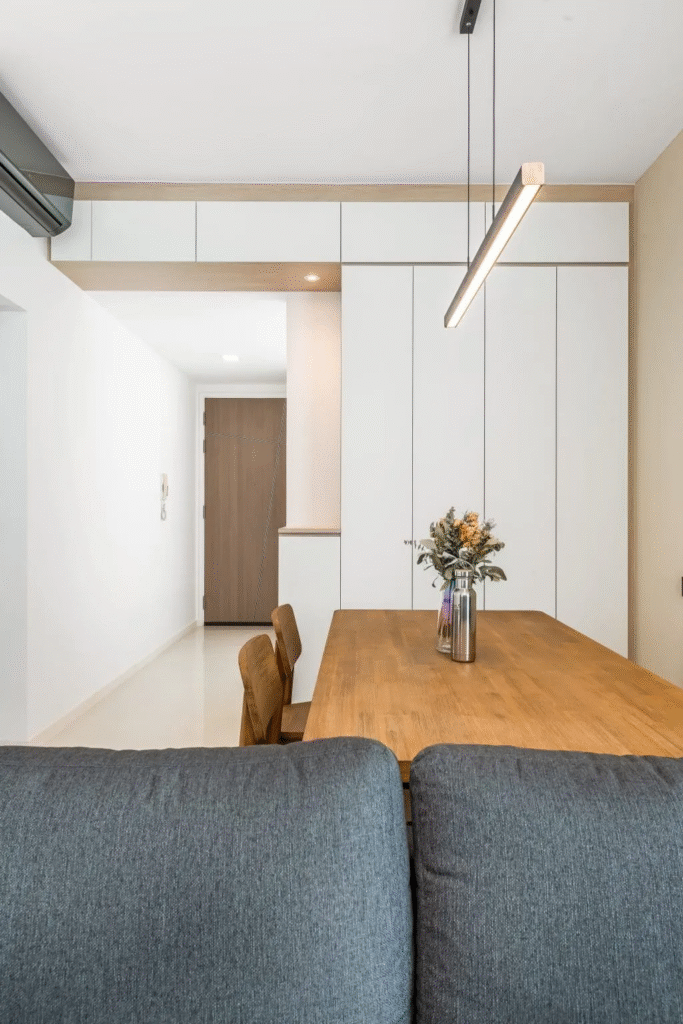 This Japandi dining area highlights the beauty of clean lines and warm natural materials. The light oak dining table sets the tone with its simple, unembellished surface, paired with matching wooden chairs that bring a grounded, Scandinavian calm. A small metal vase with understated dried florals adds a soft organic touch without cluttering the space. Behind the table, sleek floor-to-ceiling white cabinetry blends seamlessly into the wall, offering hidden storage that supports the minimalist Japanese ethos of keeping only what you need. The slim, modern pendant light hanging above the table introduces a subtle architectural element, while the soft beige wall and the peek of a charcoal sofa in the foreground tie in the muted Japandi palette. The overall effect is serene, modern, and effortlessly functional, showing how Japandi decor turns simplicity into a statement.