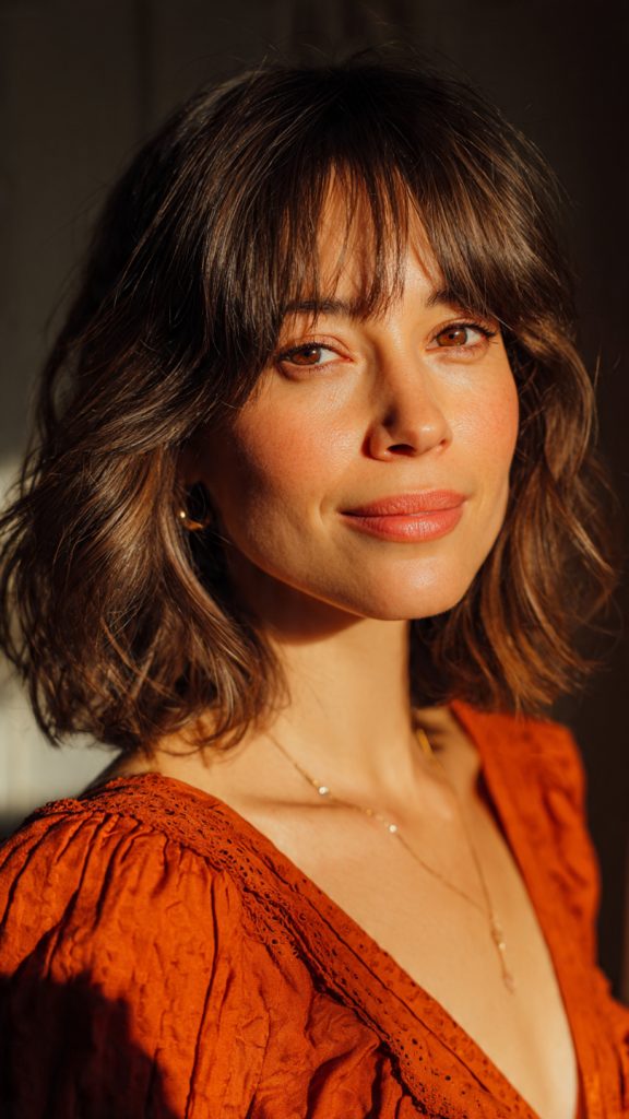 Curtain bangs paired with medium-length hair frame the face beautifully and add a soft, elegant look.