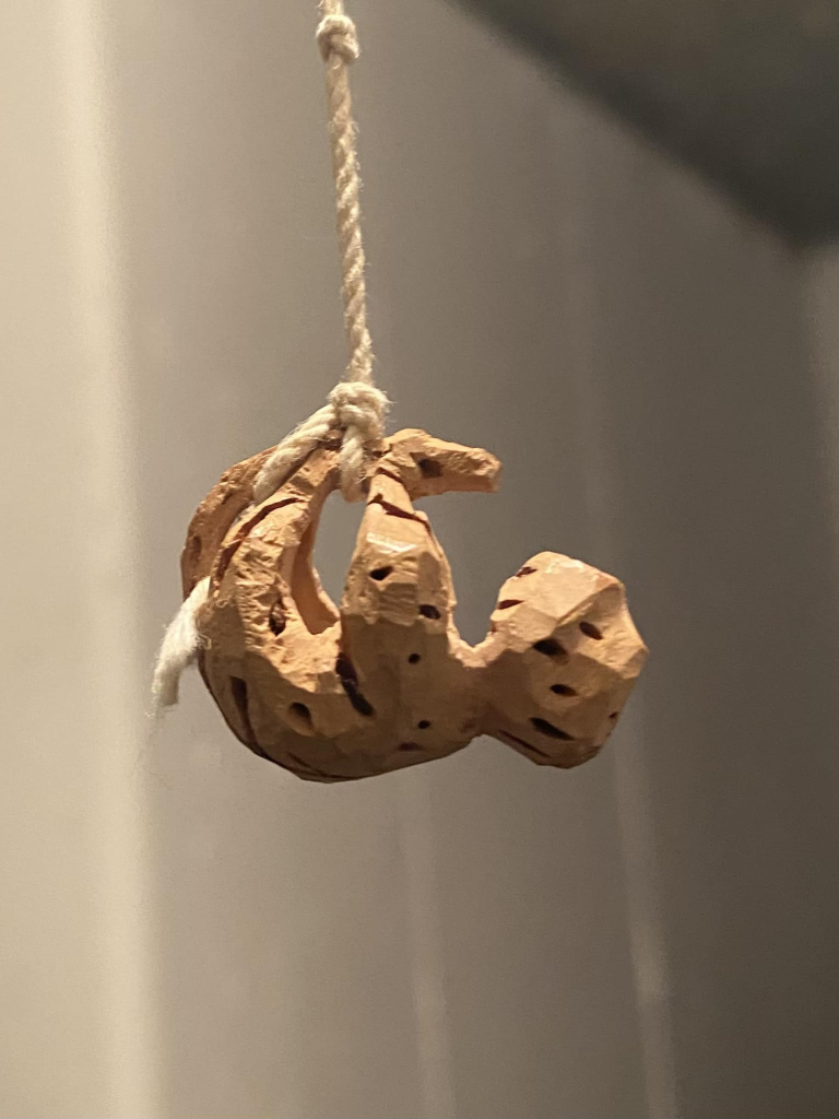 This monkey carving hangs from a rope, curled into a compact shape. The rough surface and deep tool marks give it a raw, handmade feel. The pose feels relaxed, almost sleepy, as if the monkey is resting mid-swing.