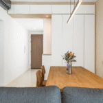 The dining table, crafted in a rich wood finish, is paired with upholstered chairs in a muted beige tone that feels plush without overwhelming the space. Above, minimalist pendant lights keep the atmosphere modern while still fitting seamlessly into the room’s overall elegance.