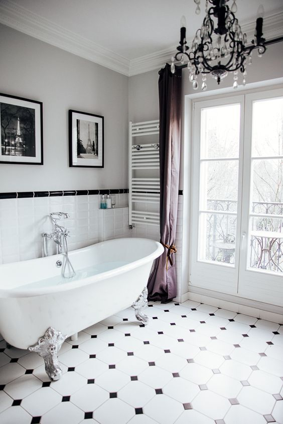This bathroom embodies the timeless romance of classic Parisian interiors. A sculptural clawfoot tub with ornate silver legs instantly anchors the space, giving it a vintage, almost regal presence. The black-and-white floor tiles enhance the old-world charm, while the glossy white wall tiles with a slim black trim create a crisp, structured backdrop that feels distinctly French.