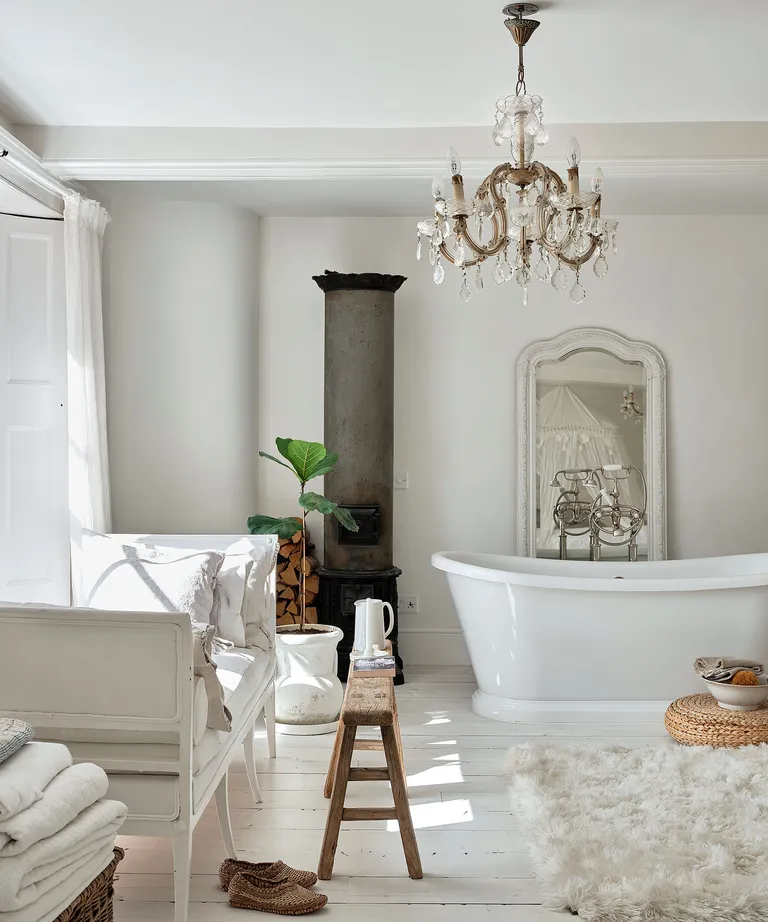A crystal chandelier adds a touch of classic Parisian glamour, its gentle sparkle contrasting beautifully with the rustic wood stool and woven accents. A small wood-burning stove in the corner introduces an unexpected, cozy element, further deepening the room’s inviting charm. Soft textiles — from the fluffy rug to the linen-covered bench — complete the space with a sense of quiet elegance. This bathroom blends sophistication and rustic warmth, offering a relaxing, countryside-meets-Paris escape.