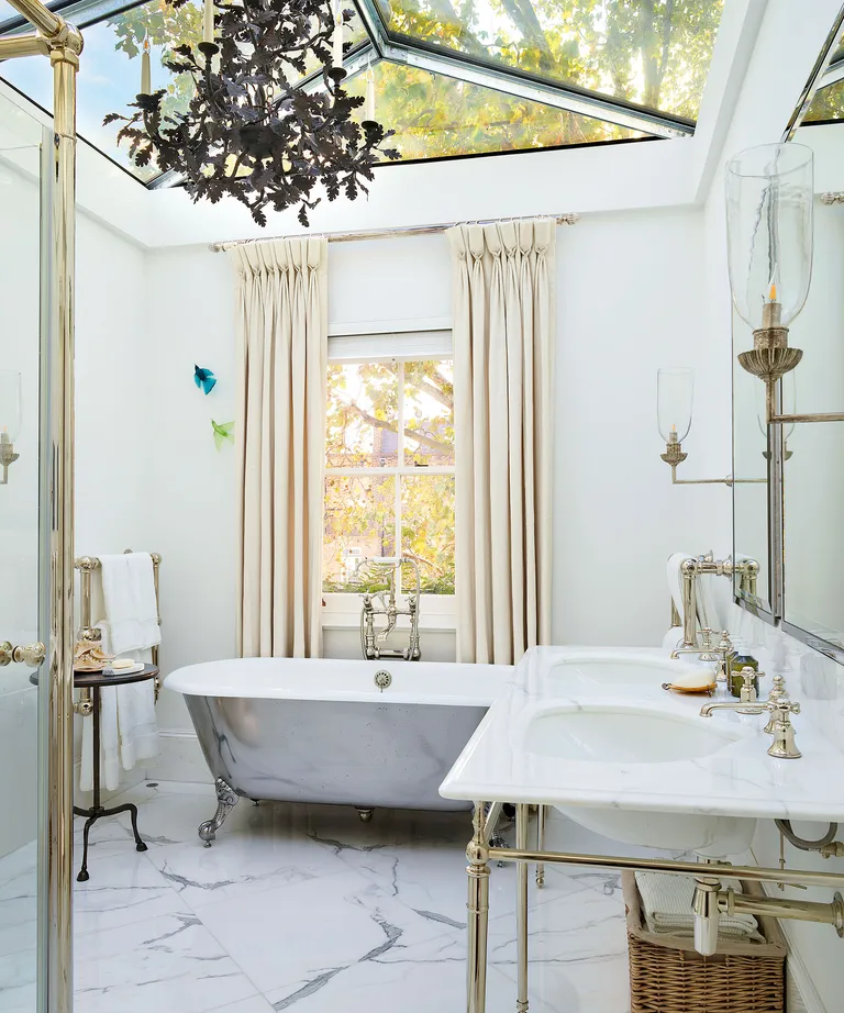 Creamy drapery frames the window, softening the abundance of light, while marble floors and a marble-topped double vanity introduce a sense of refined luxury. Delicate brass fixtures and vintage-inspired accents elevate the space with timeless Parisian charm. A sculptural chandelier suspended from the glass ceiling adds a dramatic and artistic touch, balancing the room’s airy openness with dark, intricate detail. Overall, this bathroom embodies the essence of Parisian grandeur — luminous, romantic, and effortlessly sophisticated.