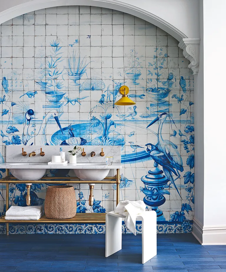 A marble double vanity with exposed brass legs adds sophistication while allowing the mural to remain the star. The polished brass faucets and fittings introduce warmth that beautifully contrasts with the cool blue tones. Dark blue flooring grounds the space, tying the palette together with depth and cohesion. A bright yellow sconce adds a bold, unexpected pop of color, giving the space a modern, playful twist. This bathroom is a stunning blend of artistic heritage and contemporary Parisian flair — truly one of a kind.