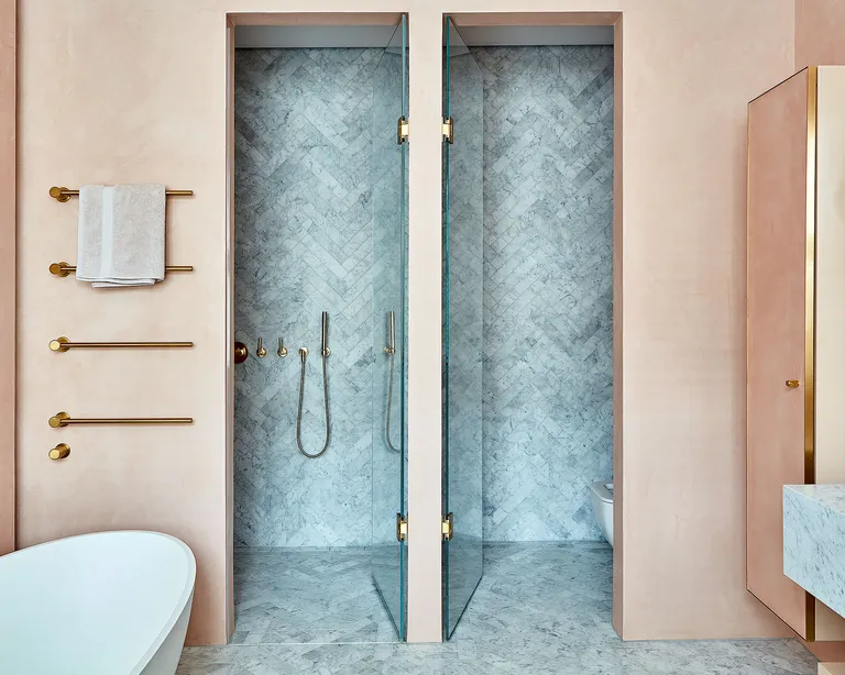 This refined Parisian bathroom pairs soft, romantic tones with sleek modern design, creating a space that feels both serene and luxurious. The subtle blush-pink walls immediately warm the room, offering a delicate contrast to the cool elegance of the marble flooring and shower interiors. Twin shower stalls clad in herringbone marble add a striking architectural symmetry, framed by minimalist glass doors with brass hardware for a clean, polished finish.