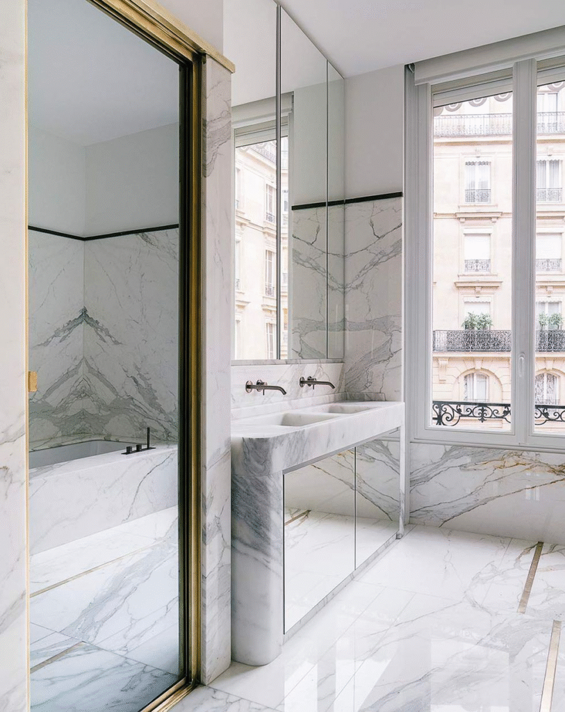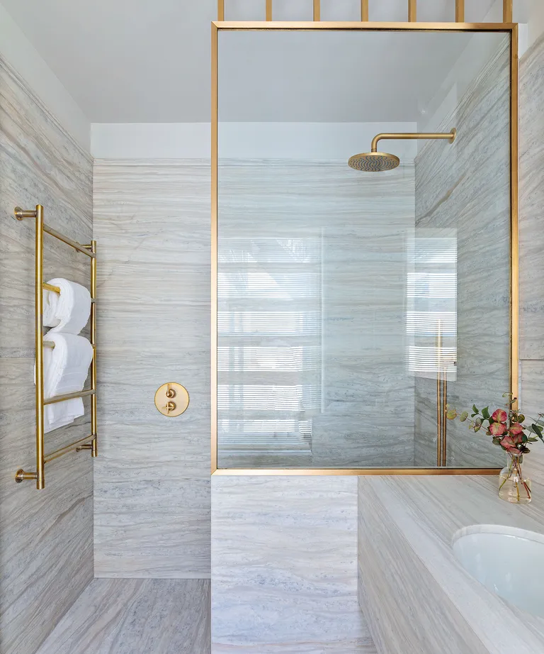 This Parisian bathroom embraces a serene, spa-like atmosphere through its soft, linear marble surfaces and refined use of warm metallic accents. The walls, floor, and bathtub surround are all clad in beautifully veined marble, creating a seamless, calming backdrop that feels both luxurious and timeless. A striking brass-framed shower screen stands out as a sculptural element, adding clean lines and a touch of Parisian glam.