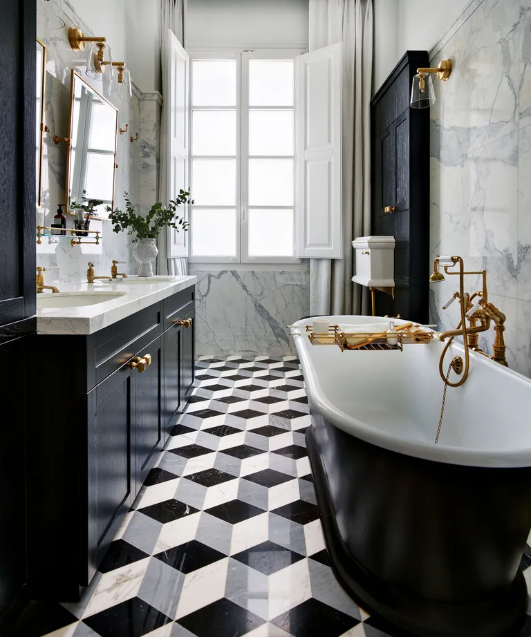 This Parisian bathroom commands attention with its bold, high-contrast palette and exquisite detailing. The striking black-and-white geometric floor sets an artistic foundation, instantly giving the space a museum-like quality. Against this dramatic backdrop, the freestanding black tub becomes a sculptural centerpiece, beautifully enhanced by ornate brass fixtures that bring warmth and vintage elegance.