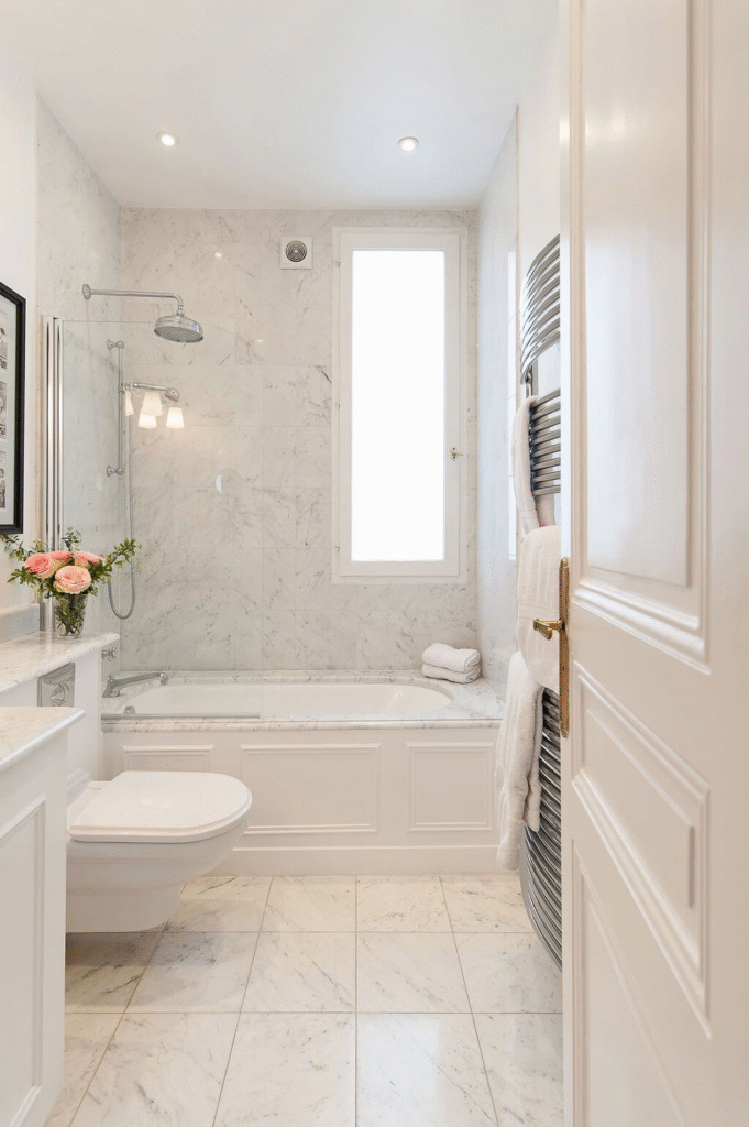 This elegant Parisian bathroom showcases timeless luxury through its full marble treatment — from the polished floor tiles to the seamless marble walls surrounding the bath. The soft veining creates a serene, airy feel, enhanced by the tall frosted window that allows natural light to pour in while maintaining privacy. The built-in bathtub features beautifully paneled woodwork, adding a touch of classic French craftsmanship that elevates the entire space.