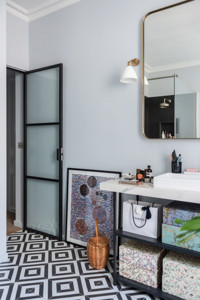 A large, gold-trimmed mirror and brass-accented sconce add warmth and sophistication, subtly leaning into the classic Parisian love for metallic details. The sleek vanity features open shelving styled with patterned storage boxes, a woven basket, and luxury accessories, adding personality without clutter. A frosted glass door with black steel framing reinforces the industrial-chic aesthetic often found in stylish Paris apartments. With artwork casually propped against the wall, this bathroom feels lived-in, expressive, and effortlessly fashionable — a perfect example of Parisian modern style done right.