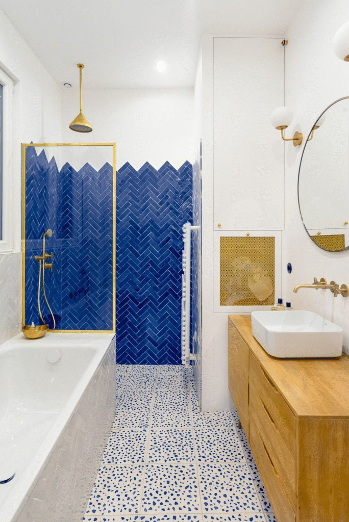This Parisian-inspired bathroom blends classic elegance with modern flair through its striking use of deep blue tiles arranged in a herringbone pattern. The dramatic color creates a sophisticated focal point in the shower, beautifully framed with slim brass trim and a matching brass shower fixture that adds a touch of Parisian luxury. Soft white walls and a terrazzo-style floor keep the space bright and airy, allowing the vibrant blue to stand out without overwhelming the room.