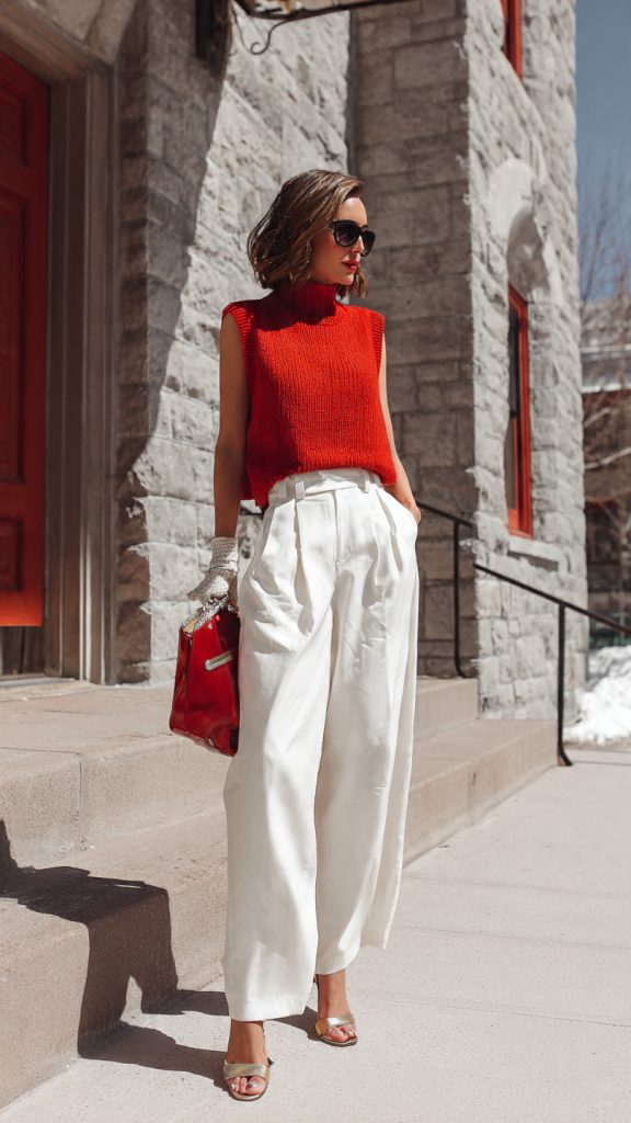 • Cropped knit tops paired with high-waisted trousers or skirts.