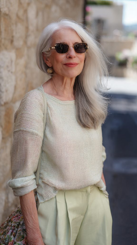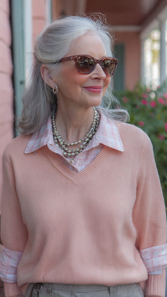 Layering is key for unpredictable spring weather. Women over 50 can create modern outfits using lightweight sweaters, knit tops, or layered blouses.