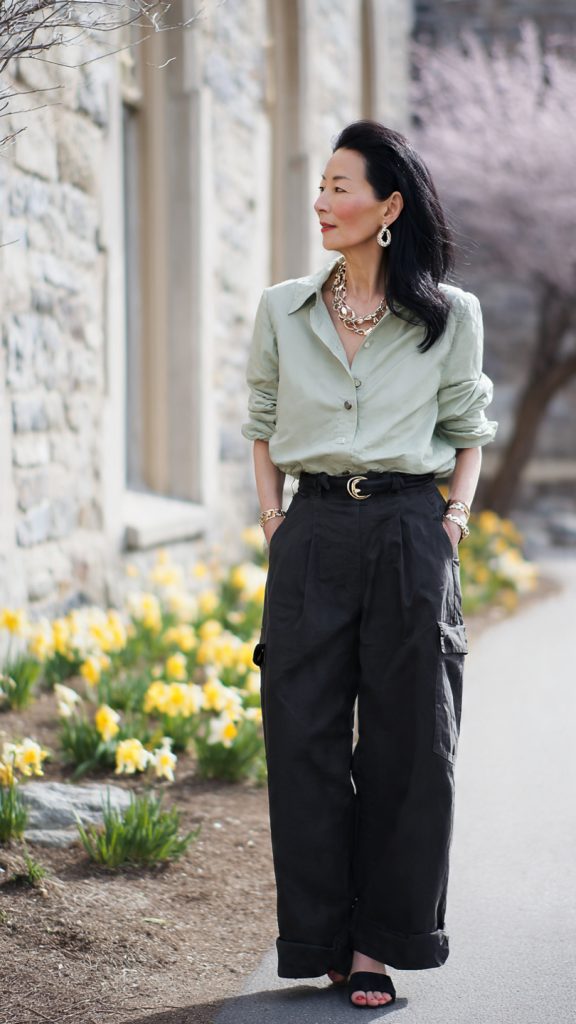 • Straight-leg, tailored, or wide-leg trousers are flattering and versatile.