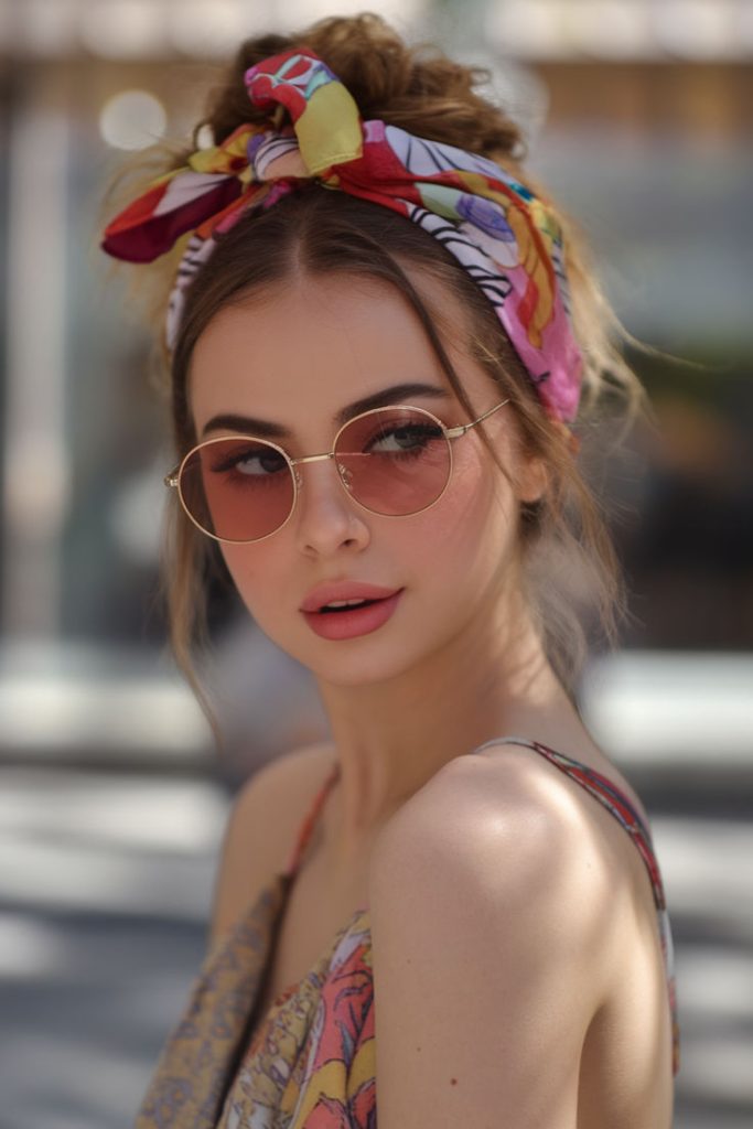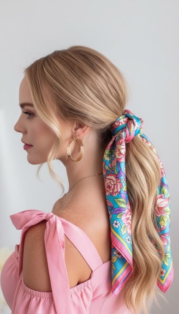 A silk scarf is one of the most underutilized accessories in hair styling, yet it solves multiple summer problems simultaneously: it adds visual interest, covers grown-out roots or less-than-fresh hair, and keeps flyaways controlled. The scarf-accented pony is both retro and thoroughly modern.