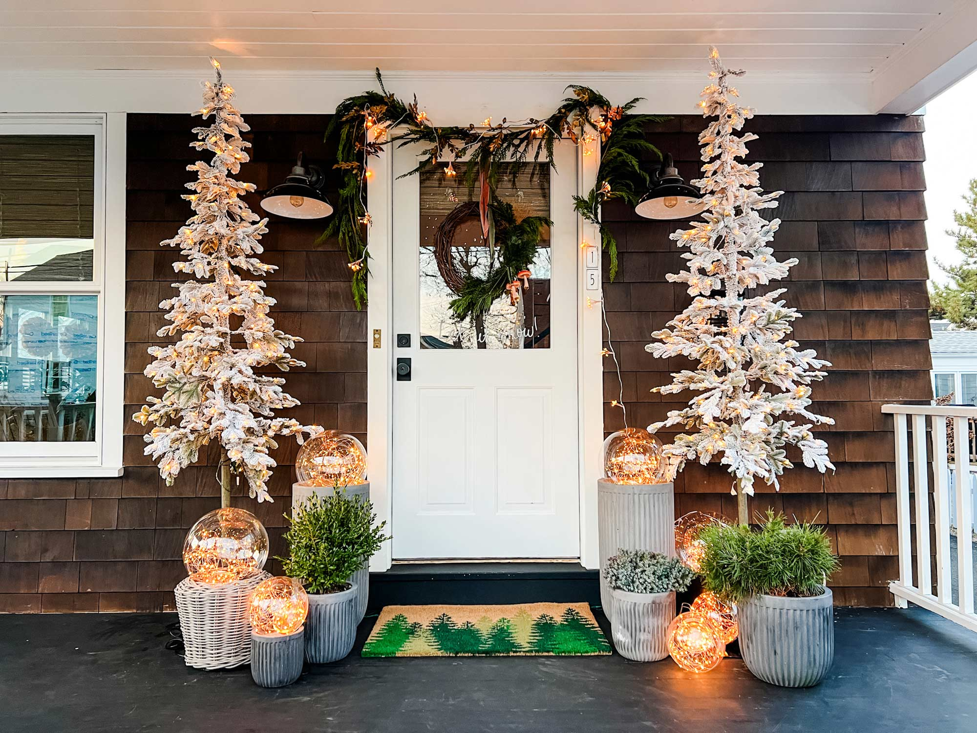 Even the smallest porch can shine. Focus on vertical lines and symmetry, using a single wreath, matching lanterns, or mini potted evergreens to keep it simple but charming.