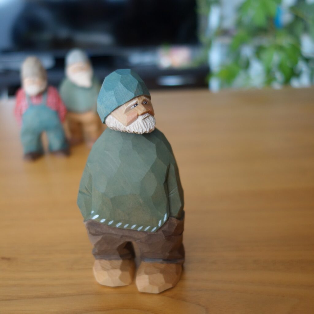 This hand-carved wooden figure portrays a bearded man in a green sweater, brown pants, and a teal beanie, gazing slightly upward with a calm, reflective expression. The blocky, faceted carving style highlights the craftsmanship and adds a rustic charm to the piece. The muted earth tones give it a natural, outdoorsy feel—reminiscent of a fisherman or woodsman lost in quiet thought. In the background, two more similar carvings can be seen softly blurred, emphasizing this figure as the focal point of the scene.