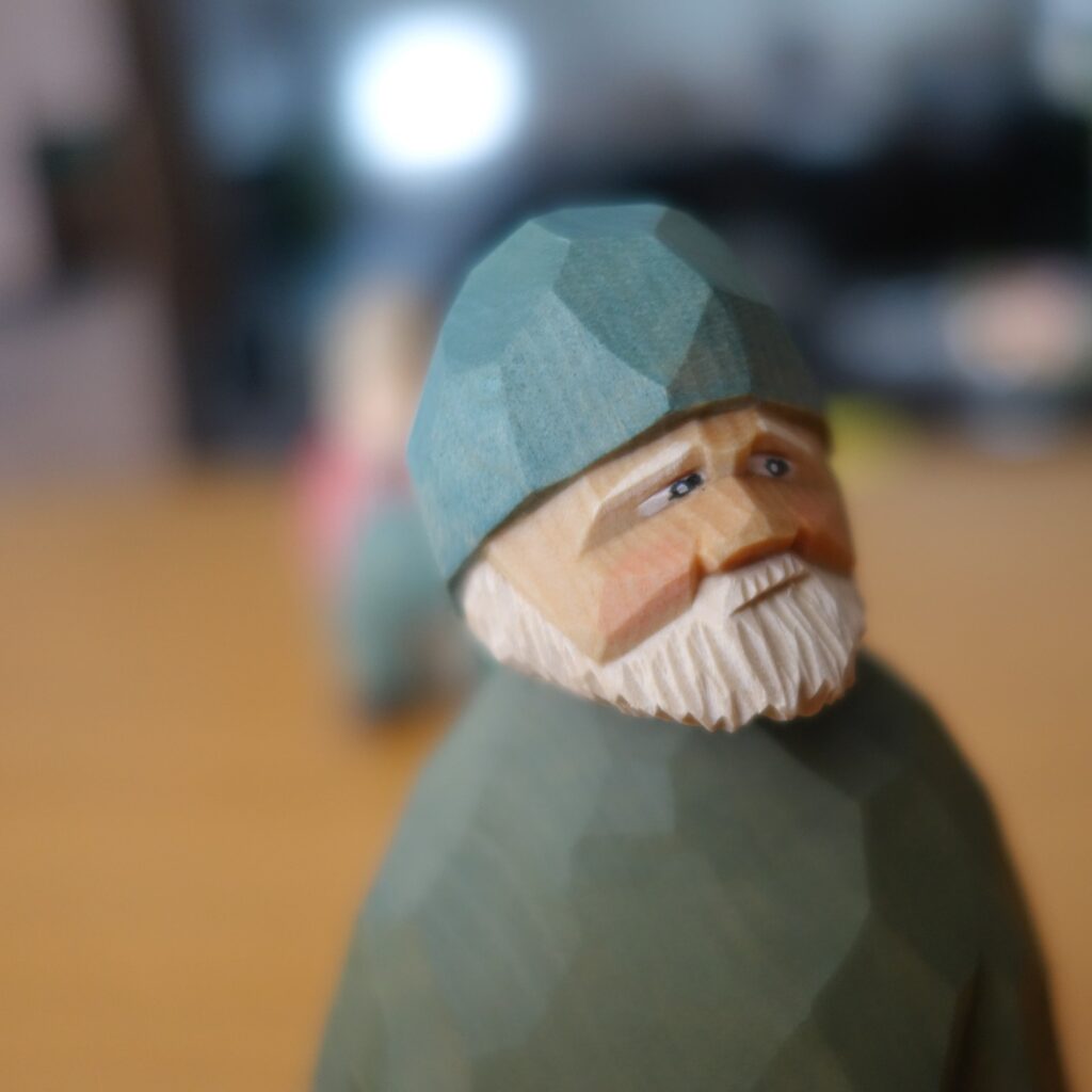 This detailed hand-carved wooden gnome exudes rustic charm, blending storytelling with fine craftsmanship. The figure features a long-bearded gnome in an earthy orange cloak and tall hat, clutching a small axe in one hand while embracing a stylized evergreen tree with the other. The textured cuts on the tree and beard highlight the artist’s attention to detail, while the soft color palette of greens, browns, and grays brings warmth and depth. Set against a backdrop of carving tools, this piece captures the spirit of woodland folklore and the quiet companionship between craftsman and nature.