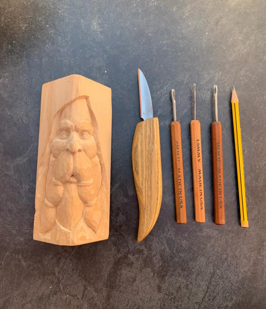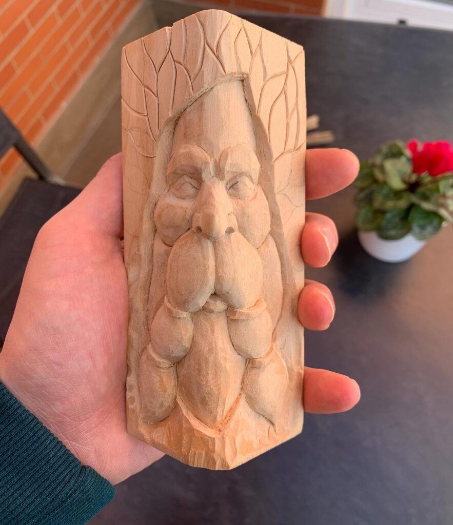 This image features a detailed wood relief carving of a mythical forest spirit, often known as a “wood spirit” or “tree spirit.” The carving showcases a long-bearded face emerging from the grain of the wood, framed by gently etched leaves that blend seamlessly into the natural surface. The artist’s skillful use of depth and texture gives the piece a lifelike presence, as if the spirit is peering out from within the wood itself. Held in hand, the piece radiates warmth and craftsmanship, making it a beautiful example of traditional whittling and nature-inspired art.