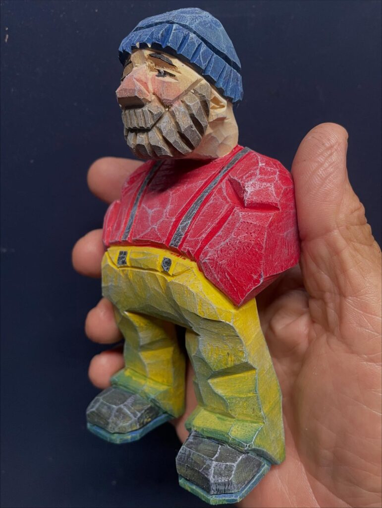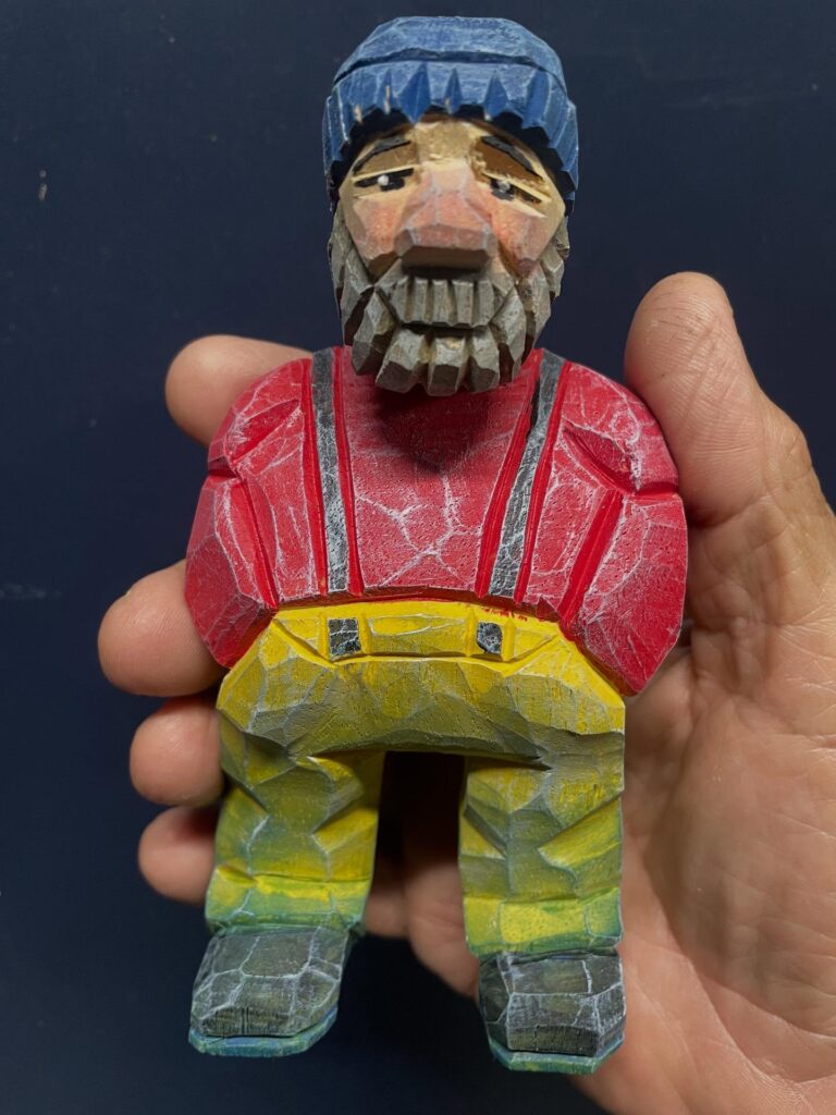 This hand-carved wooden figure depicts a rugged woodsman with a blue beanie, a thick gray beard, and a thoughtful expression. Dressed in a bright red shirt with black suspenders, yellow pants, and sturdy boots, the carving captures the spirit of outdoor life and traditional craftsmanship. The faceted texture of the wood, left intentionally rough, enhances its folk-art appeal, while the colorful paint brings warmth and personality. Held in the palm of a hand, the piece showcases both the scale and intricate skill involved in this charming whittling project.